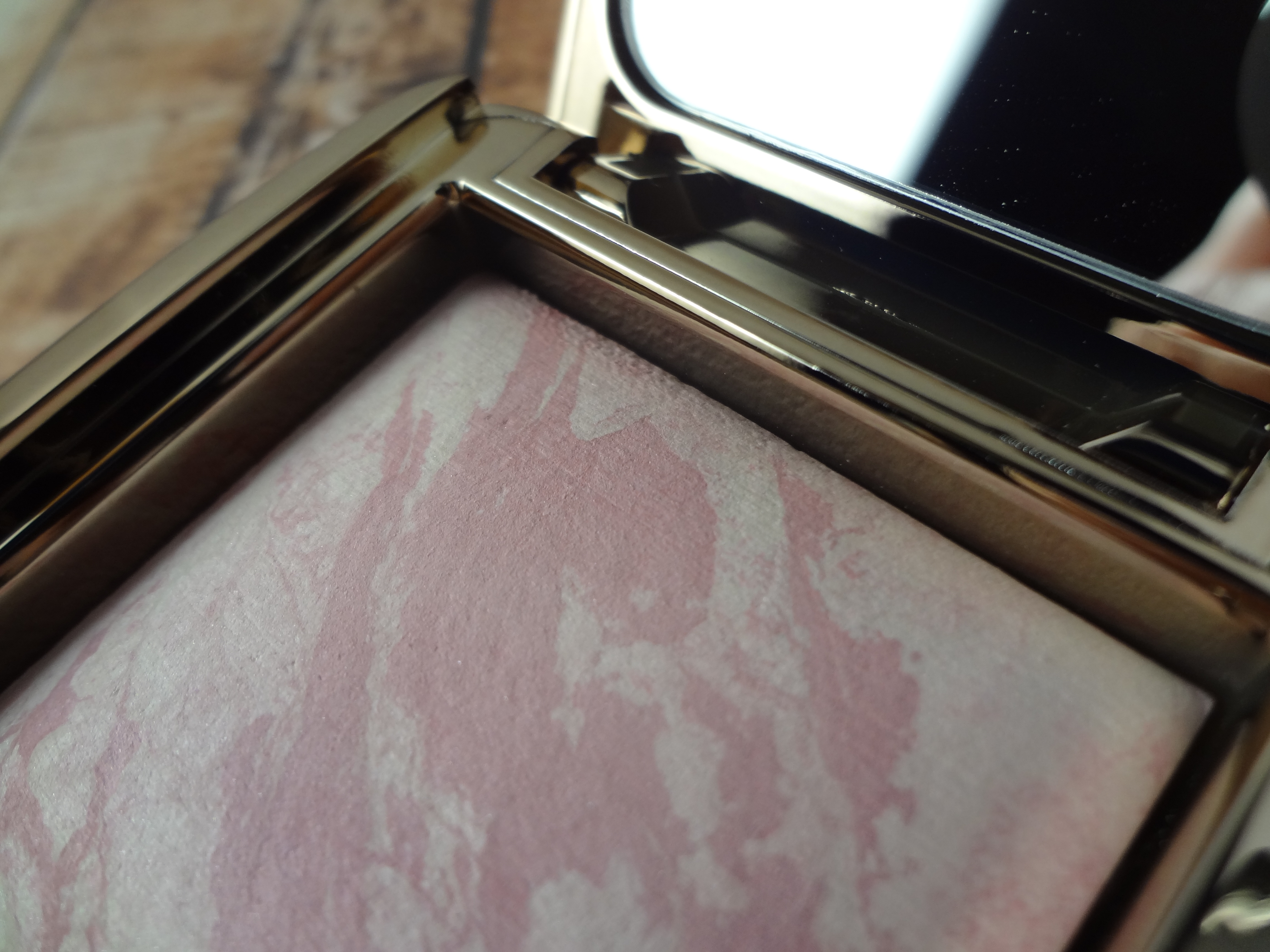These blushes come housed in a very reflective bronze plastic casing, with a nice, large mirror on the inner lid. The blush itself is absolutely gorgeous in the pan. The cool, baby pink color is swirled with the luminous champagne-white ambient lighting powder, giving it a marbled appearance. It is very finely milled and feels buttery soft on the skin. It is just a touch on the powdery side; my brush kicked up a tiny bit of powder in the pan when I swirled it.