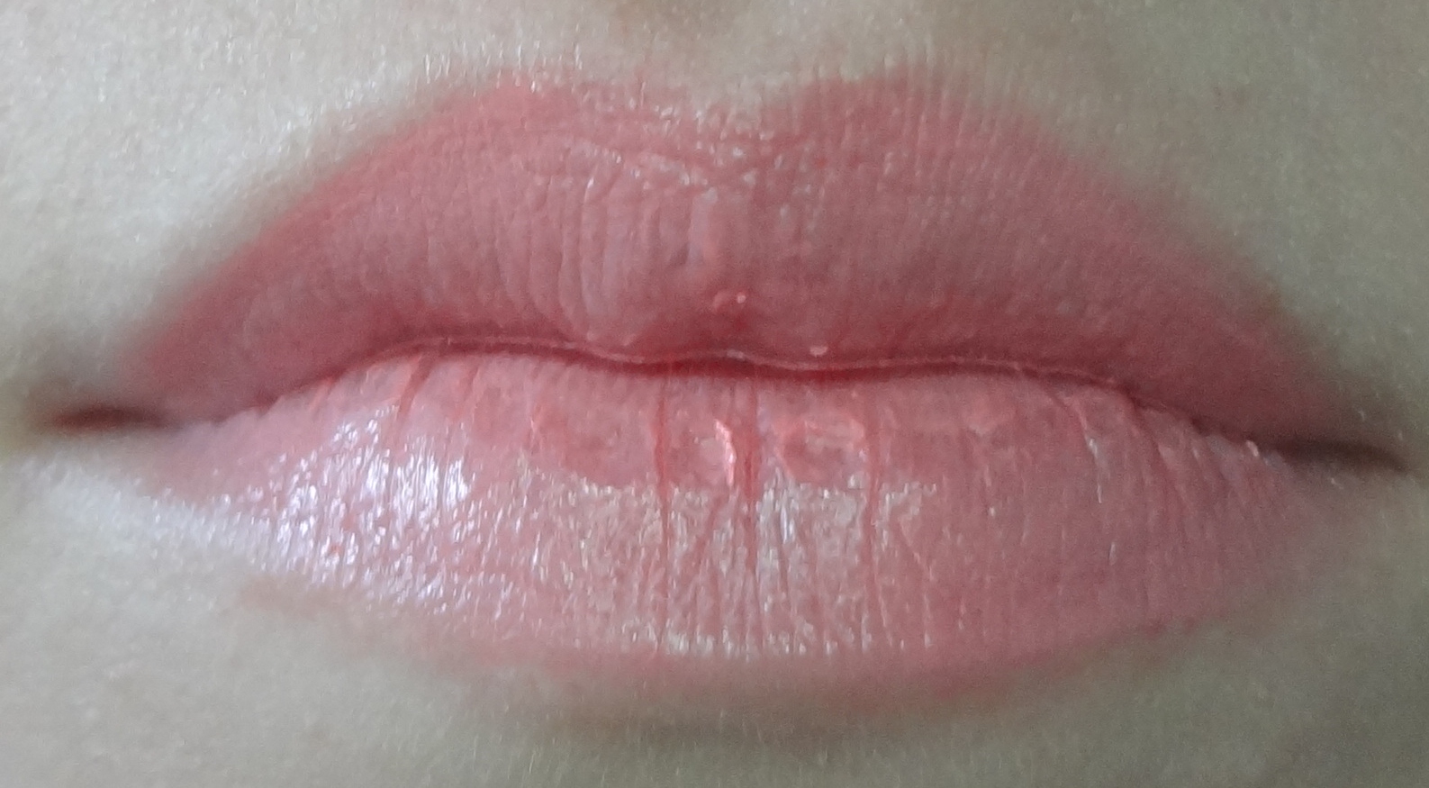 Unfortunately, there is a milkiness to the formula of this color that doesn’t work on me. No matter what I do, it really settles into my crevices and highlights every little dry spot on my lips. I applied it very lightly in the lip swatch shown here; if I try to layer on anymore than that, in an effort to make it more opaque and build it up to the true baby pink that it swatches as on my arm (above), it gets far too milky and unflattering. ::sadface::