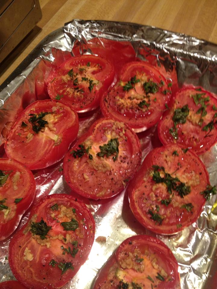 Aaaaand then I made another tomato dish. (What?! It was early July; the tomatoes were gorgeous–I couldn’t help myself!) This time I made the “Oven Browned Tomatoes” (pg 527)