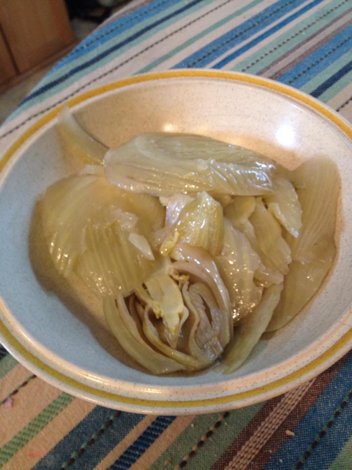 Braised FennelAlong with the meatballs, we tried a new vegetable: “Braised Finocchio with Olive Oil” (pg. 593)