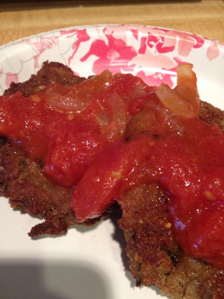 eggplant patties with tomato and onionNext, I made the “Eggplant Patties with Parsley, Garlic, and Parmesan; Variation 1 with Onions and Tomatoes” (pg. 499)