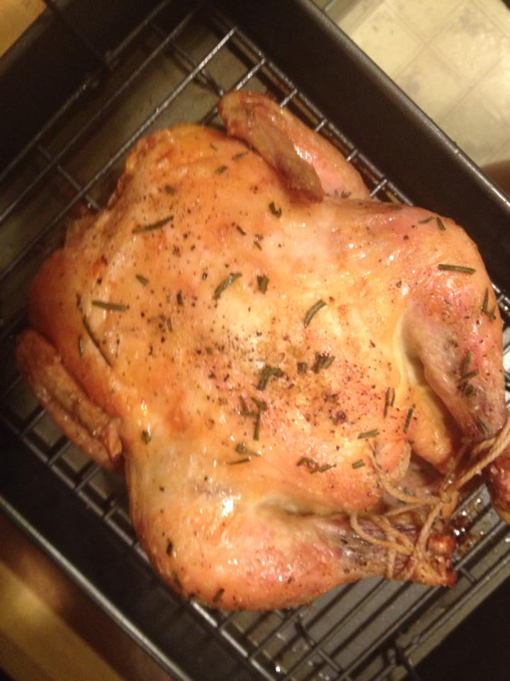 rosemary garlic roasted chickenKnowing I’m not great with getting into the kitchen on a weekday night after work, I decided to take some initiative one night when I was feeling particularly energetic and roast a big chicken, to re-purpose through the week in various meals. I used the “Oven Roasted Chicken with Garlic and Rosemary” (pg. 328).