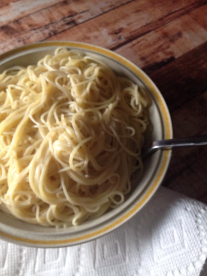butter cheeseA few nights later, I wasn’t feeling well. A post-migraine stomach upset made me crave comforting, simple carbs, so I made “Butter and Parmesan Cheese Sauce (pg. 191)